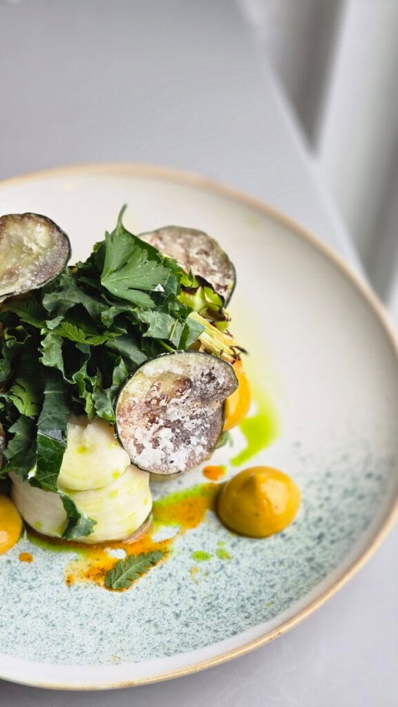 - Grillede grønnsaker fra Brimse. Sellerikrem med sitrus, chilicrisp, urtemajones og squash chips. Inneholder selleri og cashewnøtter