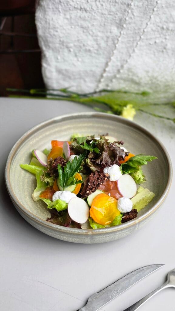 - Salat med laks fra Janas lakserøkeri. Frisk salat, pepperrotkrem og sprø rug. Inneholder fisk, melk, hvetemel og rugmel