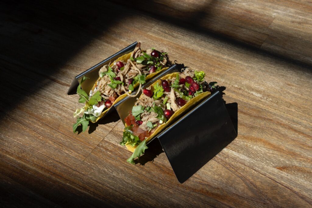 - Taco 00s Style. Hard shell tacos flyt med grønn salat, hjemmelaget tomatsalsa med pulled dielam fra Klostergården, yoghurtbasert dressing med mynte, toppet med koriander og granateplekjerner. A: Spor av soya, melk og sulfitt.