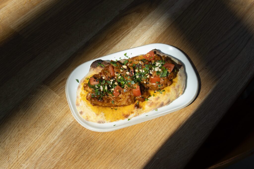 - Juicy sataykylling i hjemmebakt pitabrød med tomater og persille, toppet med peanøtt og sesamfrø. A: Sesam, peanøtt, hvete og gluten.